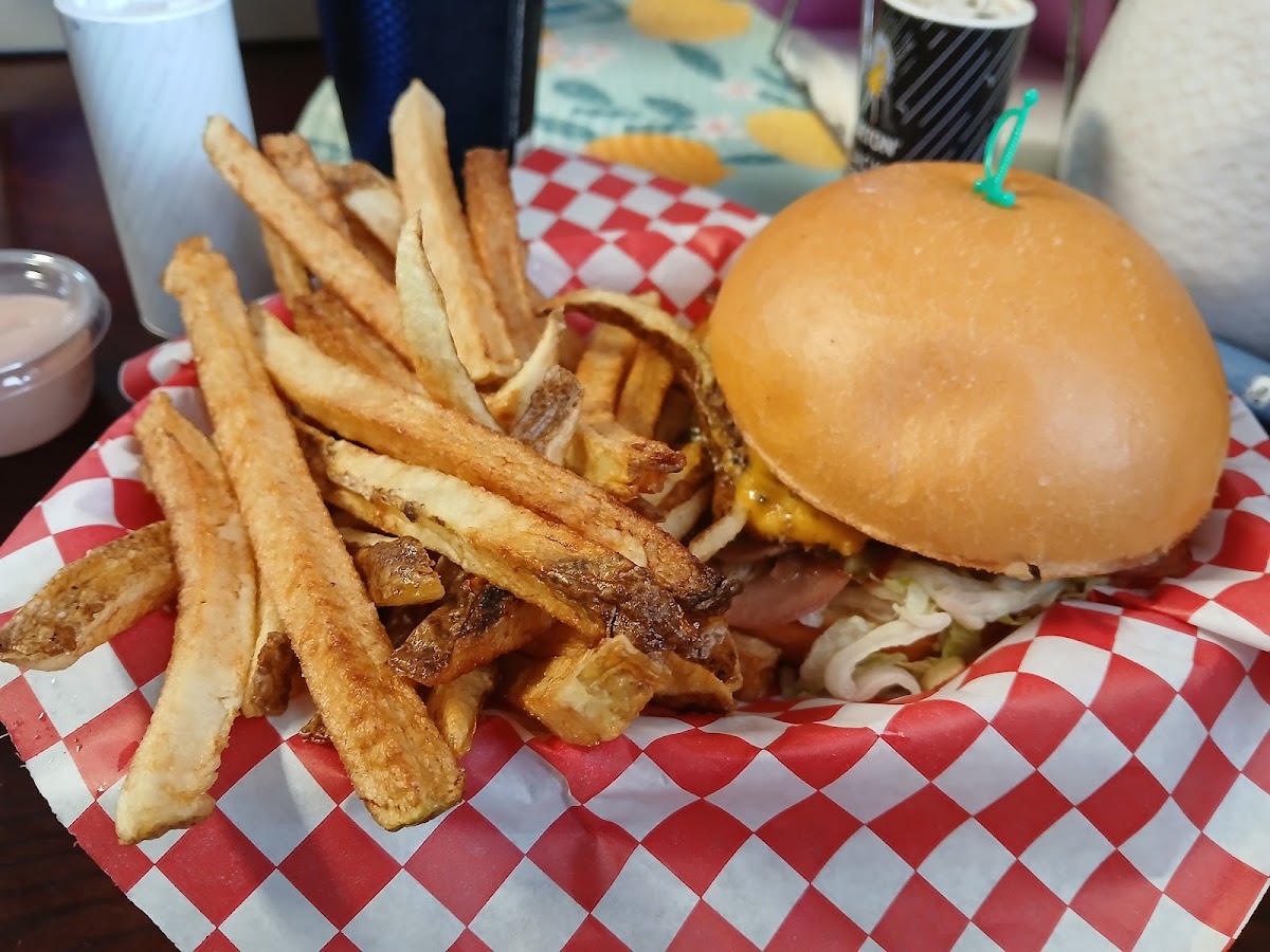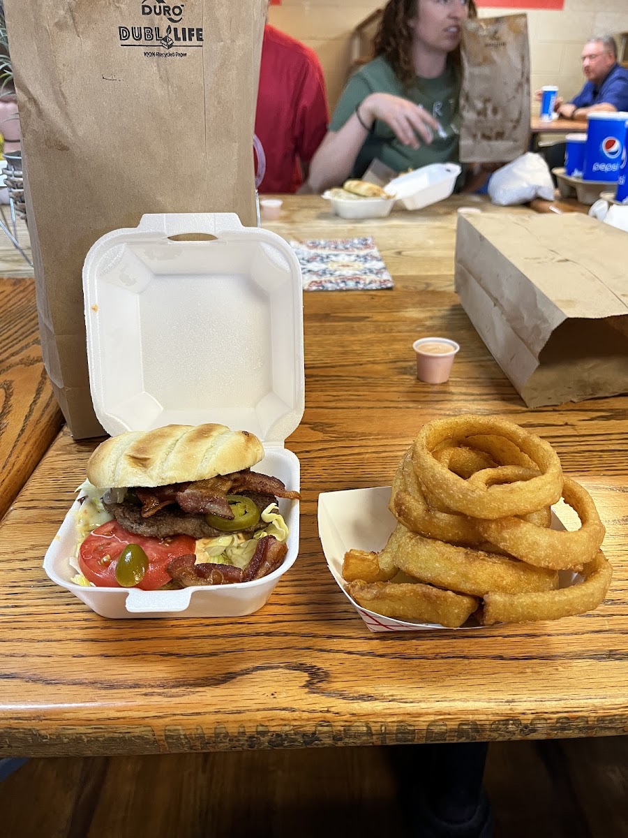 This place was great. I got the jalapeño bacon burger with onion rings. Both were very delicious. The hamburger tasted really fresh and I believe the buns are homemade. The onion rings were nice and crispy. Overall everything was great. Classic diner food with a neat atmosphere and I would definitely come again.